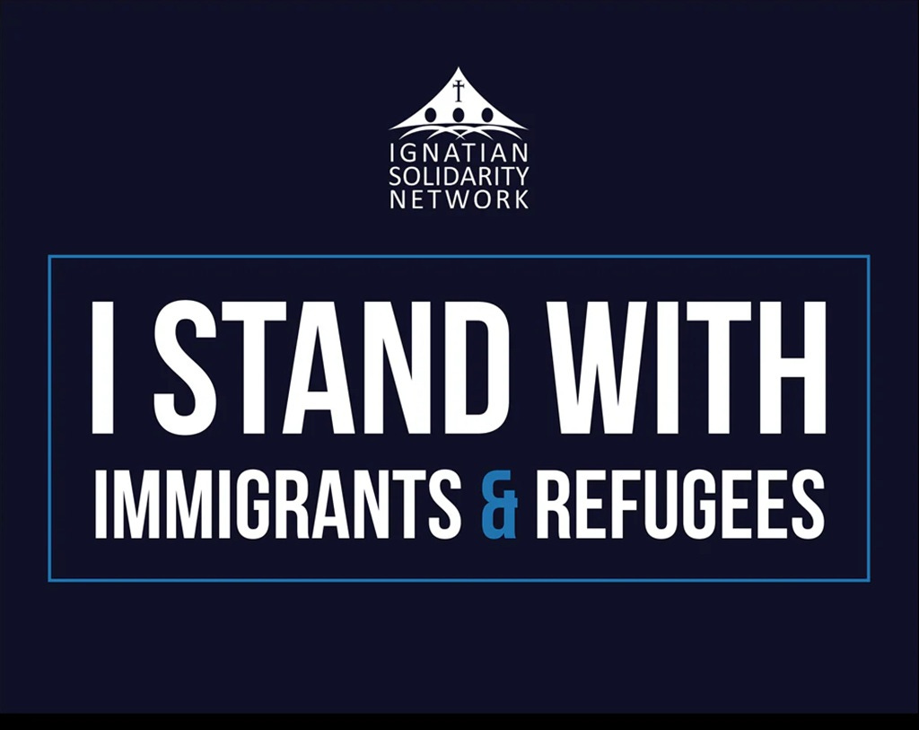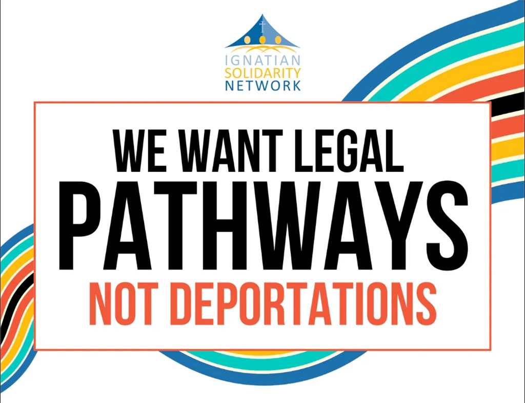 “We Want Legal Pathways“ and “I stand with immigrants and refugees“ rally signs from the Ignatian Solidarity Network.